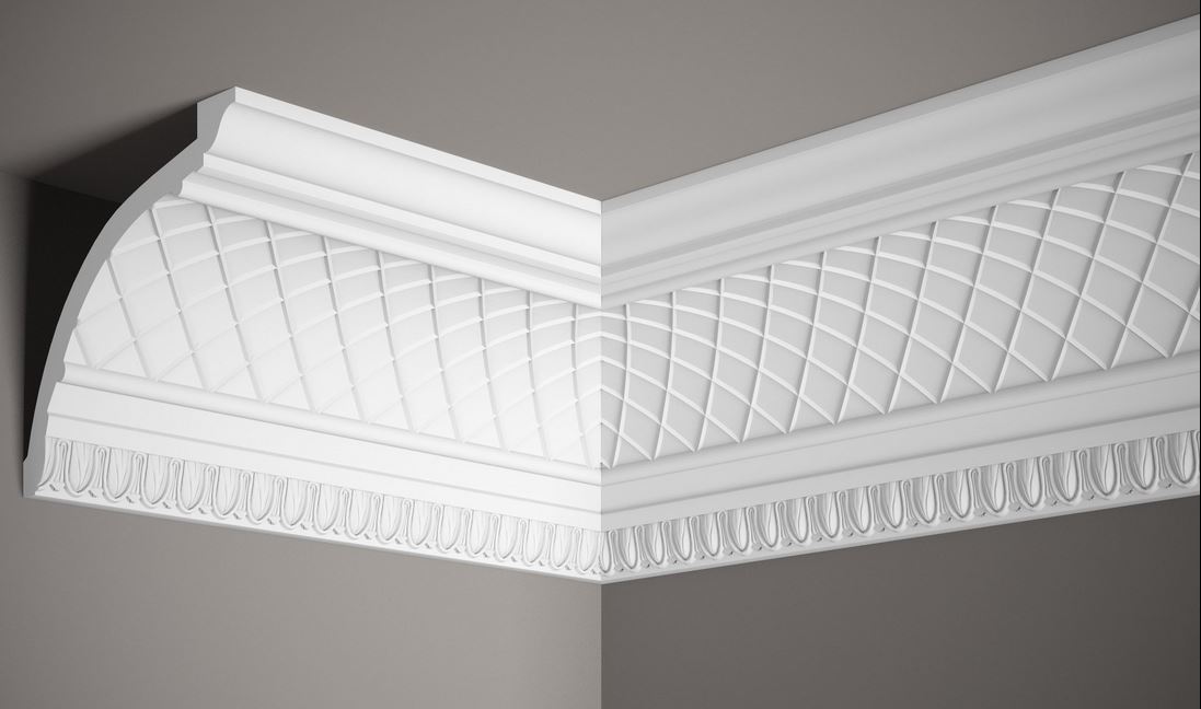 Stuckleiste "Decke 401 PU" Maße 16,9x14,1cm (Leistenlänge von 200 cm) Die modern geformte Leiste ist mit einem 3D Dekor gestaltet und schafft durch ihr einzigartiges Design eine besondere und einmalige Raumatmosphäre. Der gesamte Raum gewinnt eine maximale optimierte Aufwertung.