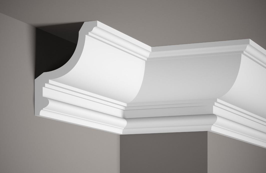 Stuckleiste "Decke 154 PU" Maße 15,4x12cm (Leistenlänge von 200 cm) Die modern geformte Leiste ist mit einem 3D Dekor gestaltet und schafft durch ihr einzigartiges Design eine besondere und einmalige Raumatmosphäre. Der gesamte Raum gewinnt eine maximale optimierte Aufwertung.